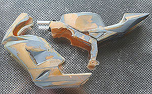 おおかた中身がくりぬけたので、カウルとフレームを 分離してみました。あらかじめカウルサイドとフレーム 下にビス穴をあけてあります。これから隠れていたフレーム の欠損部を作っていきます。 |