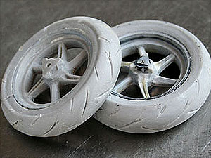 約1ヵ月かかってしまったタイヤですが、溝を切り直すために、ラバーの溝を一旦パテ埋めてスリック状にしたものをレジンに置き換えました。写 真は自作した溝のデカールを貼ったところです。このデカールをあたりにして、溝を切っていきます。 |