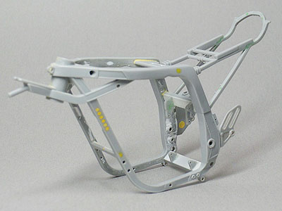 フジミ初の本格的バイクキットということもあり、タミヤキットのように、誰でもが組みやすいとはいえません。 ただ、全体のフォルムやバランスは問題ないので、作りがいのあるキットになっていると思います。 テストショット段階で、かなりの箇所を修正してもらったのですが、全て修正できたわけではありません。 一番問題なのは、エンジンを挟み込んでフレームを組むようになっていることです。 エンジンを後載せできるようにエンジンハンガーを加工していきます。 |