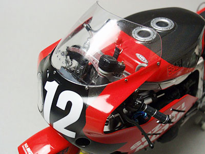 完成しました! スクリーン越しに見えるように、タンクの取り付けは実車同様にバンド留めです。 なかなかイイ感じです。 |