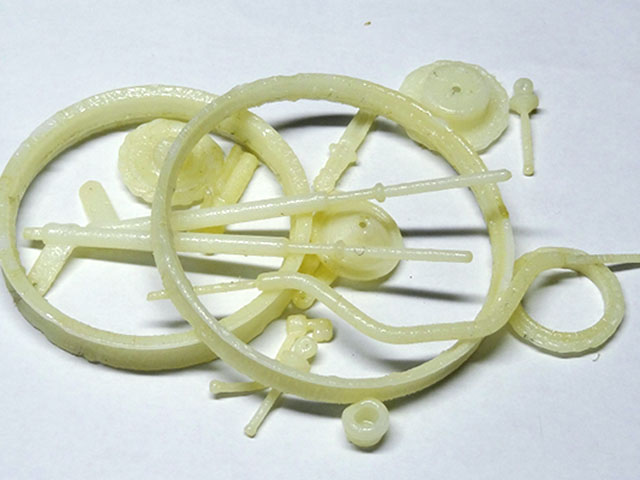 ![]() メッキ部品は全てメッキを落としてから作業に入るのがいつものやり方、今回も全ての部品を漂白剤とシンナーを使って落とそうとしました。 クロームメッキには下地にもう一層メッキ下地が処理されているので、シンナーに漬け込んで剥離させようとしたら、シンナーを間違えたらしく全部溶けてしまいお釈迦様になってしまいました。 これではお手上げ、早速リタイヤ・・・そうも思いましたが滅多に手に入らないキットをそうやすやすと諦めるわけにも行かないので、失った部品はスクラッチする事に決めて気を取り直して出直す事にしました。 |