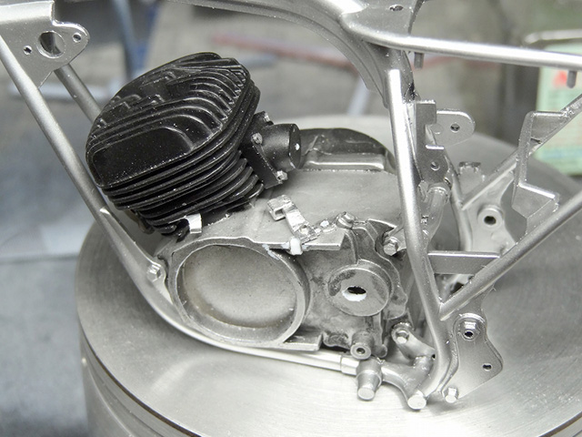 ![]() 大まかにエンジンが出来たのでフレームに搭載するためのブラケットをエンジン側に付けています。 フレーム側に最初に付けてしまうと搭載出来ないのですが、この辺の説明は一切なされていません。 キットのモールドも大雑把ですが、説明書も極めて大雑把、かなり先の段階まで仮組みは欠かせません。 クラッチのレリーズレバーも部品として無いので作らなければなりません。 |
