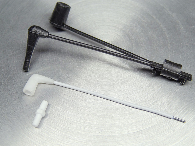 ![]() プラグとコード。 キット部品は黒い方でビニールの様な材質の一体成型物、非常に見た目が良く有りません。 プラ棒を使ってプラグとキャップを作り、プラグの方はガイシとネジ部分の色分けをします。 完成後は結構見える所ですから。 |