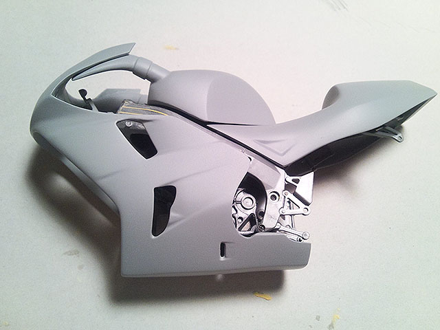 ![]() RC30をベースにアッパーカウルにパテを盛りました。RC45とはだいぶ形が違います。アンダーかウルは別にすると合わせが大変だと思いますので、仕上げ優先で接着してしまいます。タンク、シートカウルも同様に、パテにて整形を進めていく事になります。 |