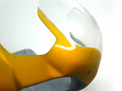 スクリーンはカウルに瞬間接着剤で接着して、カウルごとヤスリで削って形を整えます。 こんなことして、きれいになるの?と聞かれますが、塗装した後からどうやってスクリーンをくっつけたらいいのかわからないので・・・。 |