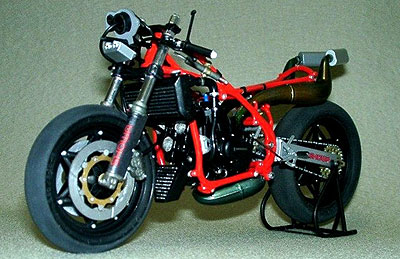 フレームはアルミ角の形状から、鋼管パイプに見えるように整形、 写真左がノーマル、写真右が加工中です。結構雰囲気変わりました。 同じく丸パイプフレームのRGBやドゥカNCR&888等のフレームを観察して 参考にしつつ削っていってます。まだ時間が掛かりそうです。 | |