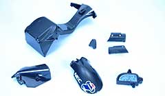 I have first to draw the pattern od the body cowls. So I apply Tamiya tape of every body parts and I draw the borders with a pen. All the patterns thus drawing are applied on a transparent plastic shhet and scanned. |